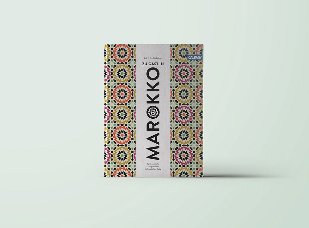 Das marokkanisches Muster in Gewürztönen ist tiefgeprägt, die Titelformulierung steht ganz pur auf einer Banderole aus edlem Strukturpapier. Gestaltung und Umsetzung des Umschlags Für Gramisci Editorialdesign, erschienen im Callwey Verlag