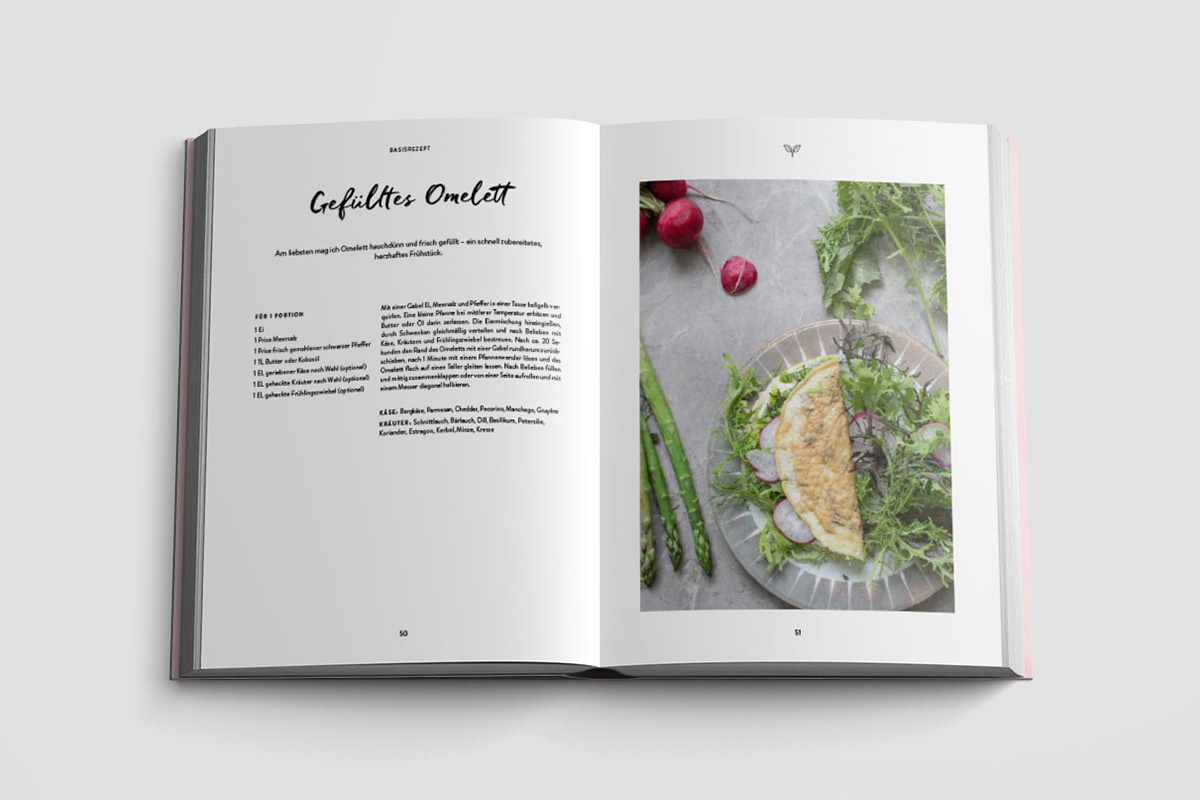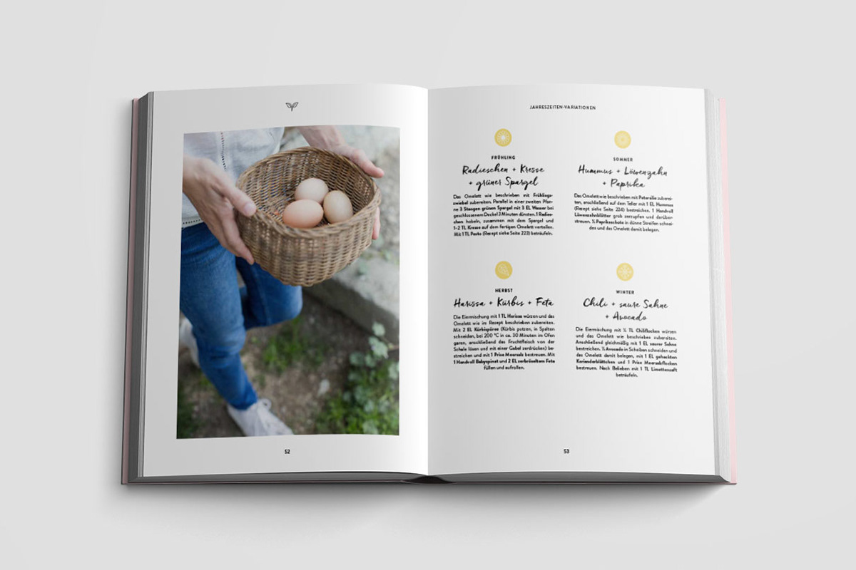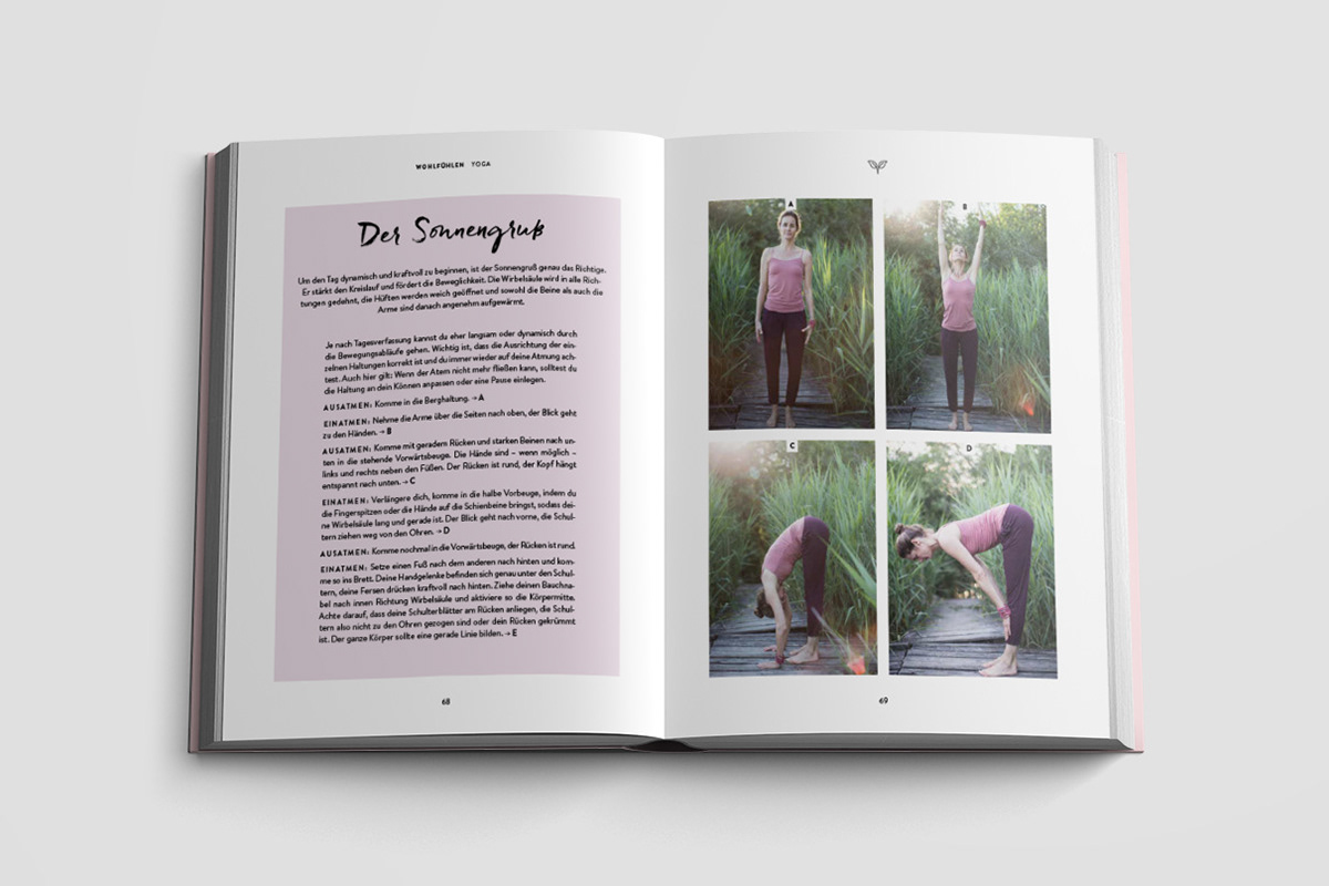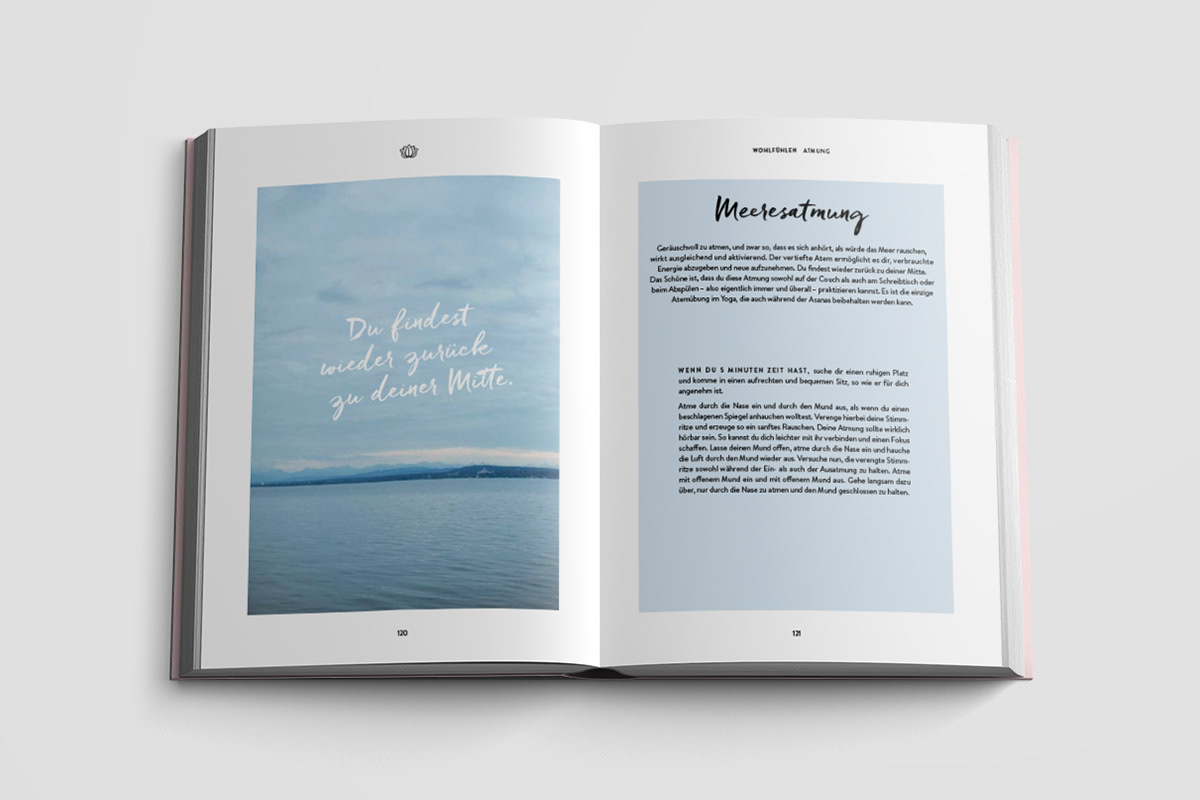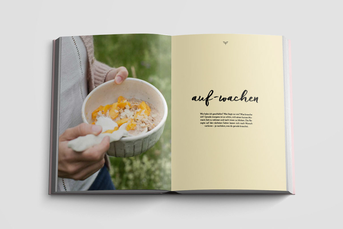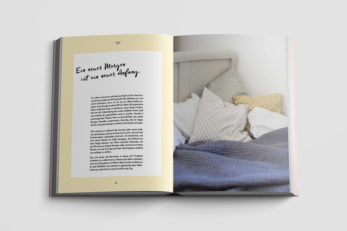 Hell, pur und klar gestaltet, mit einer kraftvollen Handschrift begleitet das Buch durch den Tag: vegetarische Rezepte, sanfte Yoga-Übungen und kleine Meditations-Einheiten. Gestalterische Konzeption und Umsetzung von Cover und Innenlayout, erschienen im Hölker Verlag